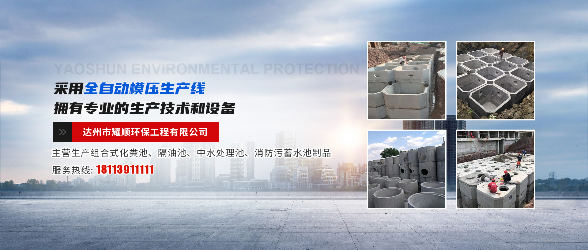 達(dá)州市耀順環(huán)保工程有限公司位于四川東北部、達(dá)州市中部通川區(qū)。本公司采用全自動(dòng)模壓生產(chǎn)線(xiàn),擁有專(zhuān)業(yè)的生產(chǎn)技術(shù)和設(shè)備,同時(shí)擁有一支專(zhuān)業(yè)的施工隊(duì)伍。本公司堅(jiān)持質(zhì)量第一、互惠發(fā)展,讓您的居住環(huán)境更美、更舒適,是我們工人的宗旨。本公司愿與廣大建筑同仁一道,為美化城市作出貢獻(xiàn)。我公司現(xiàn)生產(chǎn)組合式化糞池、隔油池、中水處理池、消防污蓄水池制品。我們的產(chǎn)品在建筑工程中不斷接受檢驗(yàn),具有安裝便捷、施工安全、用時(shí)短、結(jié)構(gòu)合理、堅(jiān)固耐用、抗?jié)B性能好、凈化效果明顯、經(jīng)濟(jì)合理的優(yōu)特點(diǎn)。...